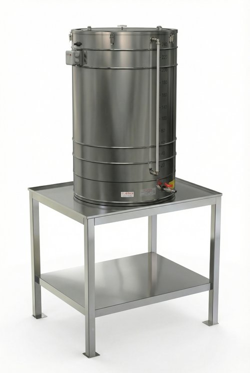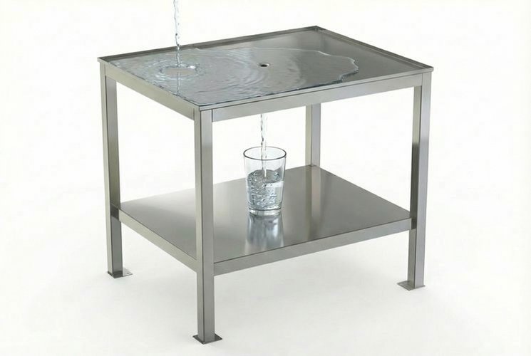 Верхняя полка подставки выполнена в виде приёмного лотка, обеспечивающего сбор пролитой жидкости с дальнейшим сливом через дренажное отверстие в центре полки. За счёт такой конструкции реализована возможность сбора пролитой воды или иной жидкости с дальнейшим сливом через приёмный штуцер в накопительную ёмкость либо канализацию, что значительно упрощает работу с водой и водными растворами.